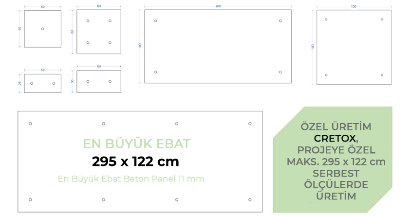 - CRETOX Seri Ebatları : 240 x 120 | 120 x 120 | 60 x 120 | 15 x 120 / panel