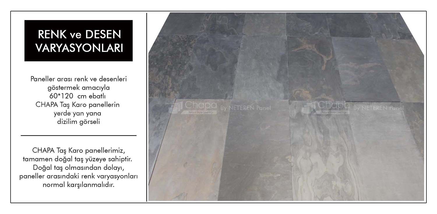 CHAPA Doğal Taş Panellerimiz %100 doğal taş katmana sahiptir. Doğal taşın yapısına uygun olarak, herbir CHAPA Panel kendine özel desene sahiptir. Websitemizde yer alan ürün görsellerimiz, ait olduğu serinin renkleri ve tonunu gösterir niteliktedir. Desenler ve renk dağılımları, doğal taşın damarına bağlı olarak farklılık göstermektedir. Uygulamada ise renk ve desen uyumu olarak bir bütünlük sergiler.