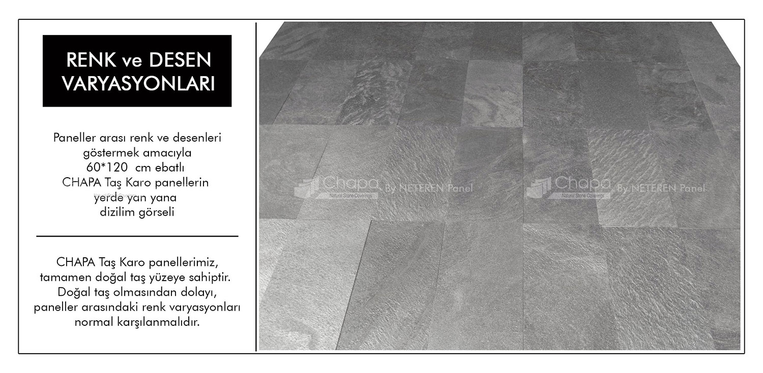 CHAPA Doğal Taş Panellerimiz %100 doğal taş katmana sahiptir. Doğal taşın yapısına uygun olarak, herbir CHAPA Panel kendine özel desene sahiptir. Websitemizde yer alan ürün görsellerimiz, ait olduğu serinin renkleri ve tonunu gösterir niteliktedir. Desenler ve renk dağılımları, doğal taşın damarına bağlı olarak farklılık göstermektedir. Uygulamada ise renk ve desen uyumu olarak bir bütünlük sergiler.