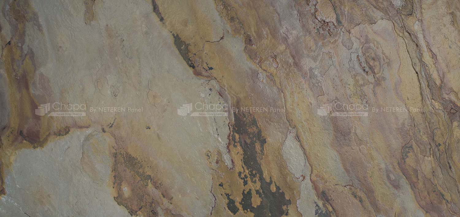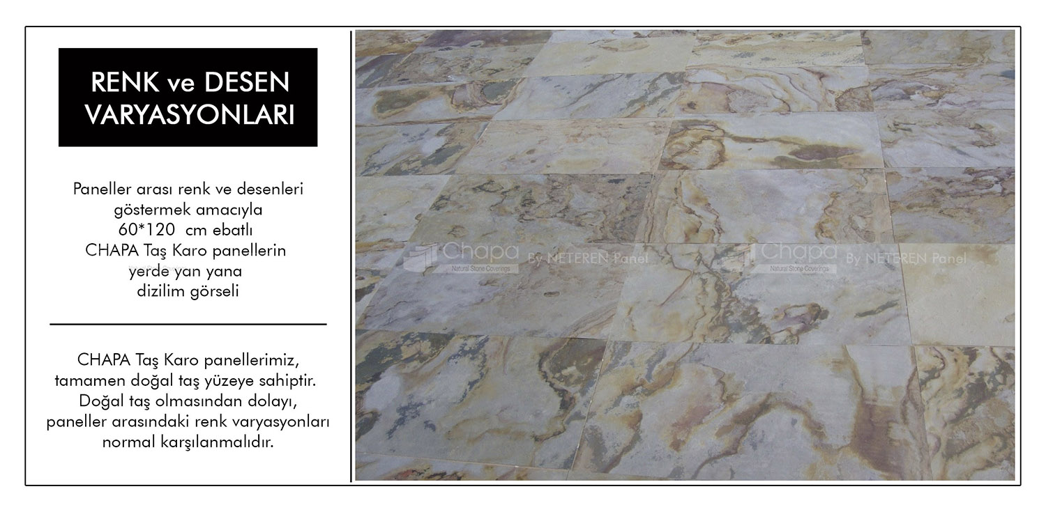 CHAPA Doğal Taş Panellerimiz %100 doğal taş katmana sahiptir. Doğal taşın yapısına uygun olarak, herbir CHAPA Panel kendine özel desene sahiptir. Websitemizde yer alan ürün görsellerimiz, ait olduğu serinin renkleri ve tonunu gösterir niteliktedir. Desenler ve renk dağılımları, doğal taşın damarına bağlı olarak farklılık göstermektedir. Uygulamada ise renk ve desen uyumu olarak bir bütünlük sergiler.